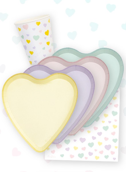 Un set tavola romantico e divertente allo stesso tempo. 4 favolose nuances pastello davvero trendy e piatti sagomati a forma di cuore.