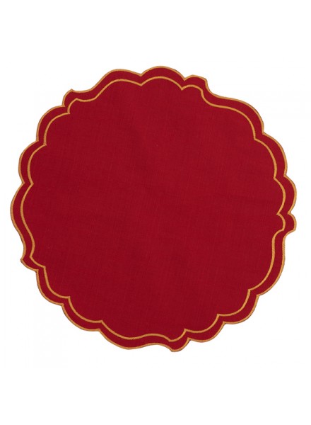 1 sottopiatto diam cm 35 in tessuto rosso con impuntura oro. Con i nostri sottopiatti della linea Lifestyle potrai arricchire ed impreziosire la tua tavola.