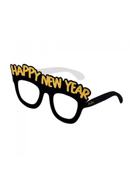 4 occhiali in carta oro con elegante scritta Happy New Year, perfetti per festeggiare l'arrivo del nuovo anno.