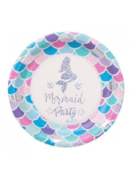 8 piatti cm 18 Mermaid. Con i piatti Mermaid, dal particolare effetto olografico, ti potrai tuffare in un mondo fantastico che ti sapra' conquistare. I piatti rispettano l'ambiente: hanno ottenuto la Certificazione Aticelca e sono quindi riciclabili nella carta.