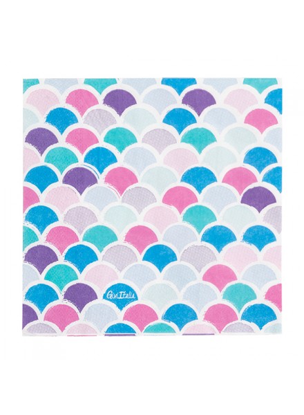 16 tovaglioli in carta cm 33x33 Mermaid. Con i tovaglioli Mermaid, perfettamente coordinati con i biatti ed i bicchieri, ti potrai tuffare in un mondo fantastico che ti sapra'  conquistare. I tovaglioli rispettano l'ambiente: hanno ottenuto la Certificazione Aticelca e sono quindi riciclabili nella carta.