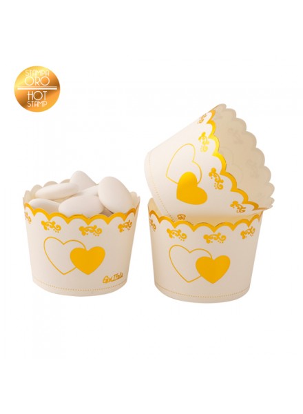 20 pirottini con finitura gold metal, pensati come contenitori per confetti, muffin o cupcakes. Belli e resistenti daranno un tocco di eleganza e originalita alla tua tavola.