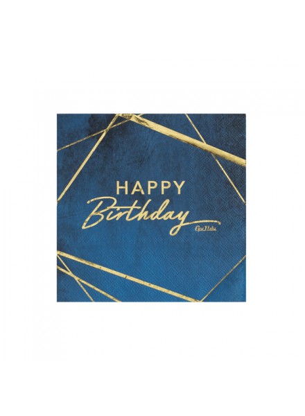 16 tovaglioli in carta da cm 33x33. I tovaglioli Birthday in Blue sono impreziositi da un motivo di linee oro metal. I tovaglioli Birthday in Blue rispettano l'ambiente: hanno ottenuto la Certificazione Aticelca e sono quindi riciclabili nella carta.