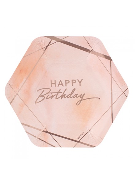 8 piatti in carta da cm 23 dalla forma esagonale. I piatti Birthday in Pink sono impreziositi da un motivo di linee rose gold. I piatti Birthday in Pink rispettano l'ambiente: hanno ottenuto la Certificazione Aticelca e sono quindi riciclabili nella carta.