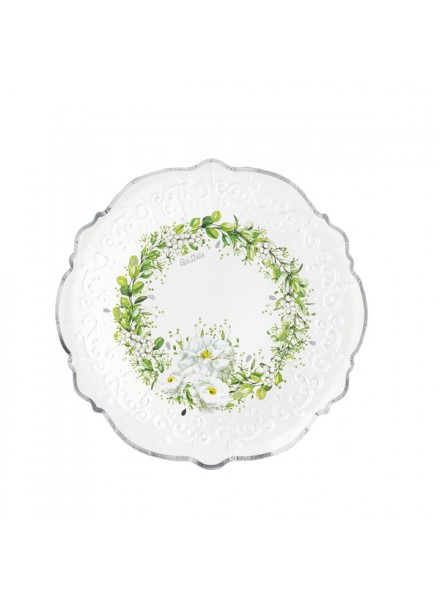 8 piatti in carta da 21 cm con finitura argento lucido e con una delicata stampa floreale. La forma embossed rendera' la tua tavola elegante e ricercata. I piatti Wedding in Green della linea Liberty rispettano l'ambiente: hanno ottenuto la Certificazione Aticelca e sono quindi riciclabili nella carta.