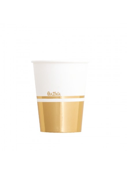8 bicchieri e 8 cover in carta da 250 cc con finitura gold metal, perfetti per allestire la tavola del tuo matrimonio o quella di un evento esclusivo ed elegante. I biccchieri rispettano lâambiente: hanno ottenuto la Certificazione Aticelca e sono quindi riciclabili nella carta.
