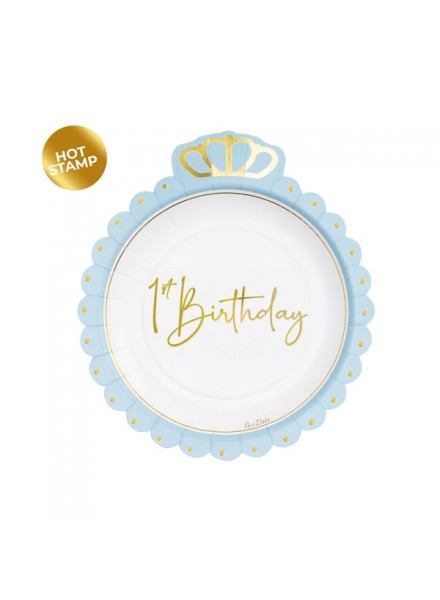 8 piatti in carta con la nuova forma con Corona, cm 20. Questi piatti sono perfetti per festeggiare il primo compleanno dell tuo bambino e per farlo sentire il principino della festa. I piatti rispettano l'ambiente: hanno ottenuto la Certificazione Aticelca e sono quindi riciclabili nella carta.