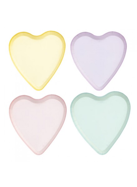 8 piatti in carta nella nuova forma cuore, cm 17x18. I piatti Candy Hearts sono assortiti in 4 colori pastello e graziosamente profilati in oro. I piatti rispettano l'ambiente: hanno ottenuto la Certificazione Aticelca e sono quindi riciclabili nella carta.