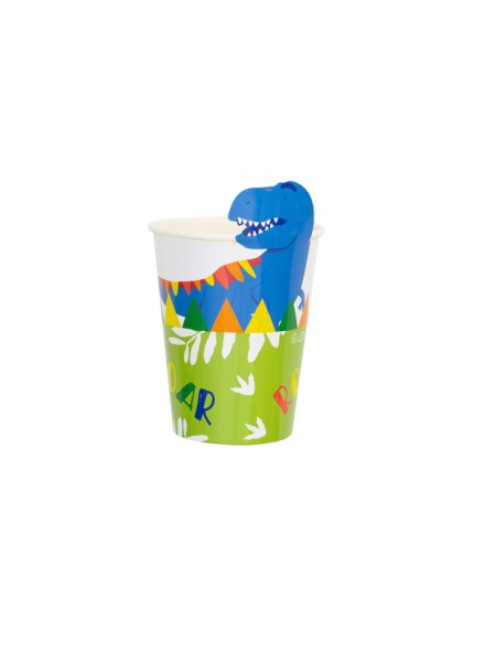 8 bicchieri in carta 250 cc con rivestimento. I bicchieri Dino Roar con il suo tirannosauro blu sapra' conquistare il tuo bambino. I bicchieri rispettano l'ambiente: hanno ottenuto la Certificazione Aticelca e sono quindi riciclabili nella carta.