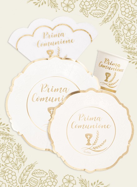 Festeggia la comunione dei tuoi bambini con il nostro coordinato dall'elegante decoro dorato.