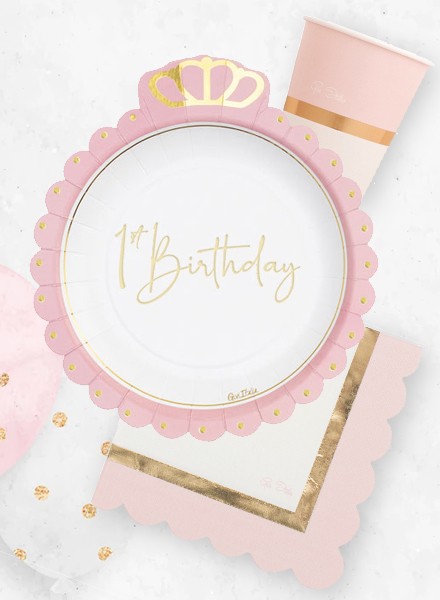 Questi piatti, dalla nuova forma a corona, sono perfetti per festeggiare il primo compleanno della tua bambina e per farla sentire la principessa della festa.