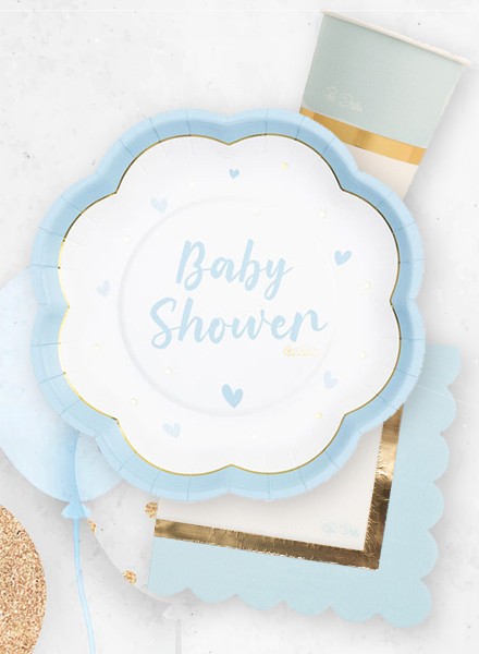 Festeggia il Baby Shower con i nostri piatti dalla originale forma a fiore impreziositi da dettagli oro e azzurro.