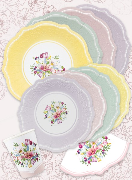 Il coordinato arricchito da un bouquet di fiori centrale ti conquistera' con il suo bordo colorato. In ogni confezione i piatti sono assortiti in 4 colori pastello.