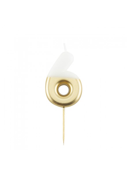 Candelina numero sei bianca con finitura oro metal su stecco. Altezza cm 10.5. Candela di compleanno perfetta per festeggiare con eleganza i compleanni di adulti e bambini.