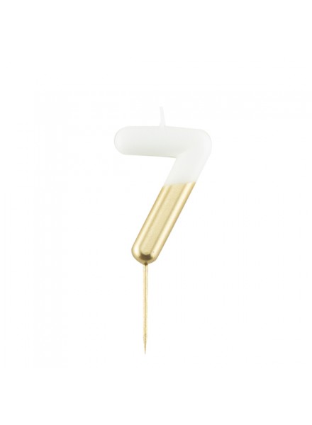 Candelina numero sette bianca con finitura oro metal su stecco. Altezza cm 10.5. Candela di compleanno perfetta per festeggiare con eleganza i compleanni di adulti e bambini.
