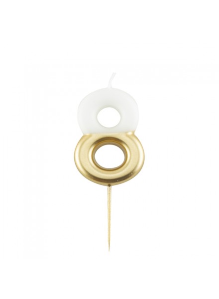 Candelina numero otto bianca con finitura oro metal su stecco. Altezza cm 10.5. Candela di compleanno perfetta per festeggiare con eleganza i compleanni di adulti e bambini.