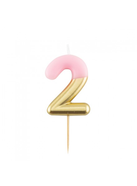 Candelina numero due rosa con finitura oro metal su stecco. Altezza cm 10.5. Candela di compleanno perfetta per festeggiare con eleganza i compleanni di adulti e bambini.