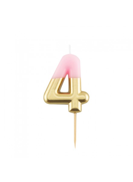 Candelina numero quattro rosa con finitura oro metal su stecco. Altezza cm 10.5. Candela di compleanno perfetta per festeggiare con eleganza i compleanni di adulti e bambini.