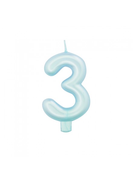 Candelina numero tre azzurro perlato con base, altezza 9 cm. Candelina compleanno perfetta per festeggiare non solo i più piccoli, ma anche gli adulti.