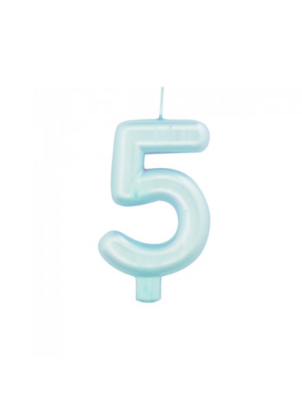 Candelina numero cinque azzurro perlato con base, altezza 9 cm. Candelina compleanno perfetta per festeggiare non solo i più piccoli, ma anche gli adulti.