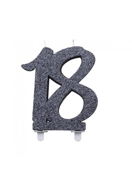 1 candela alta cm 12 a forma di numero 18 nera con glitter. La candelina 18 anni con la sua finitura glitter saprà decorare la tua torta di compleanno.