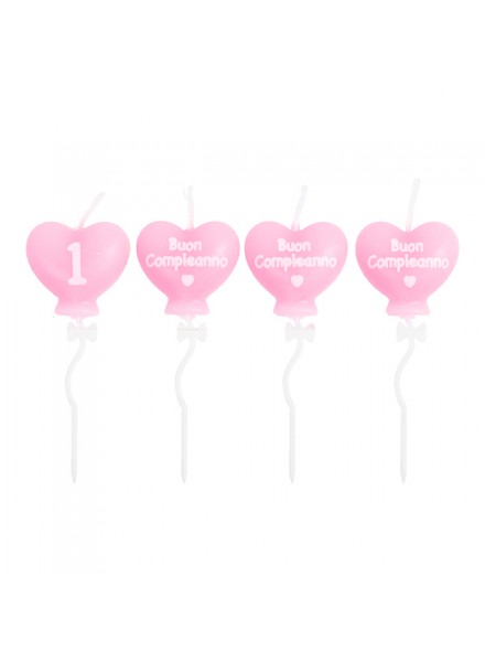 4 candeline cm 7.5 a forma di cuore con pick e fiocco. La candelina cuore con la delicata scritta 1 compleanno e' perfetta per decorare la torta della tua bambina.
