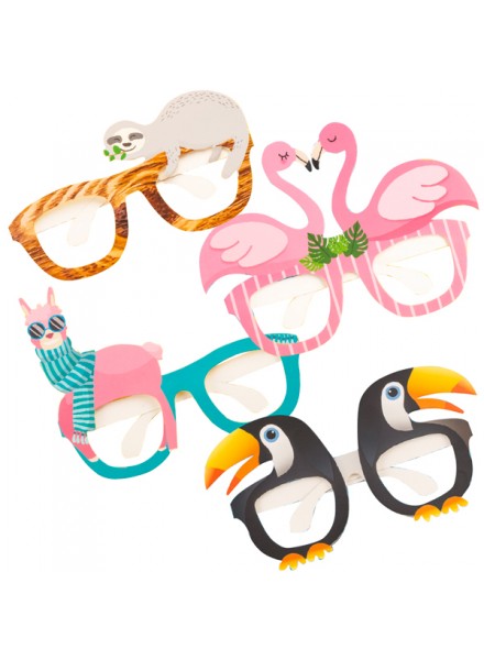 4 occhiali in carta big size soggetti animali. Questi occhiali dalla forma particolare sono dei gadget perfetti per trasformare i tuoi invitati in simpatici lama, tucani, fenicotteri e bradipi!