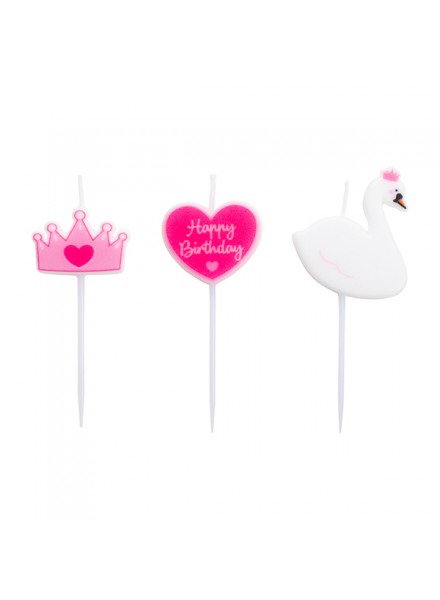 3 candeline su stecco cm 7 Principessa. Tre candeline sagomate a forma di cigno, corona e cuore che renderanno preziosa la torta della tua principessina.