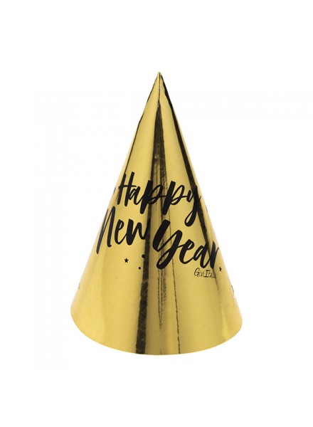 6 cappellini in carta oro con elegante scritta nera Happy New Year, perfetti per festeggiare l'arrivo del nuovo anno.