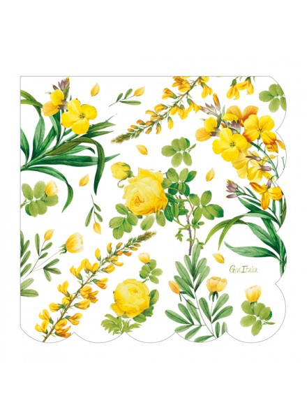 16 tovaglioli in carta cm 33x33, 3 veli. Il tovagliolo Yellow flowers e' impreziosito dalla finitura a smerlo. Questo tovagliolo della linea Lifestyle e' stato realizzato con l'intento di rendere unica la tua apparecchiatura. I tovaglioli rispettano lâambiente: hanno ottenuto la Certificazione Aticelca e sono quindi riciclabili nella carta.