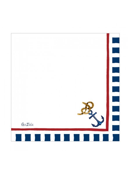 16 tovaglioli in carta cm 33x33, 3 veli. Il tovagliolo Nautical con le sue ancore e la delicata texture donera' un tocco marino alla tua tavola. Questo tovagliolo della linea Lifestyle e' stato realizzato con l'intento di rendere unica la tua apparecchiatura. I tovaglioli rispettano lâambiente: hanno ottenuto la Certificazione Aticelca e sono quindi riciclabili nella carta.