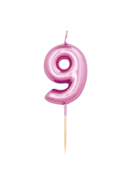 Candelina numero nove cm 7 metal Fucsia su stecco. Con questa candelina numerale, adatta ad adulti i bambini, farai risplendere la tua torta.