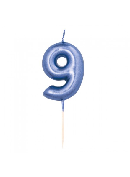 Candelina numero nove cm 7 metal Blu su stecco. Con questa candelina numerale, adatta ad adulti i bambini, farai risplendere la tua torta.