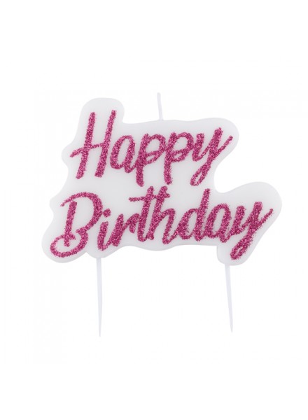 1 candelina Happy Birthday glitter fucsia cm 8x6. Questa candelina impreziosita dalla scritta glitter fucsia illuminera' la tua torta.
