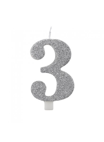 Candelina argento glitter numero tre, altezza cm 9.5. Candelina compleanno con glitter color argento: la scelta giusta per non passare inosservati.