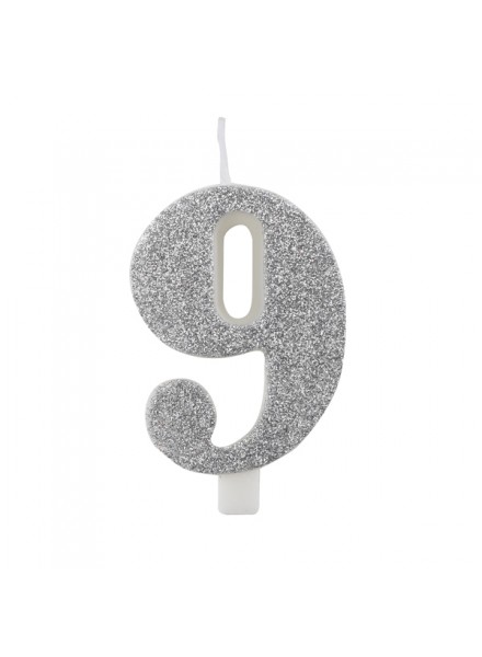 Candelina argento glitter numero nove, altezza cm 9.5. Candelina compleanno con glitter color argento: la scelta giusta per non passare inosservati.