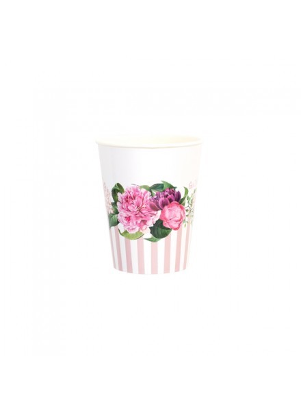 8 bicchieri in carta 250 cc con rivestimento. Il bicchiere Floral Pink ti conquistera' con il delicato bordo a raggiera color rosa e le composizioni di fiori tono su tono. I bicchieri rispettano l'ambiente: hanno ottenuto la Certificazione Aticelca e sono quindi riciclabili nella carta.