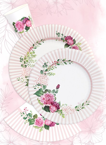 Il coordinato Floral Pink ti conquistera' con il delicato bordo a raggiera color rosa e le composizioni di fiori tono su tono.