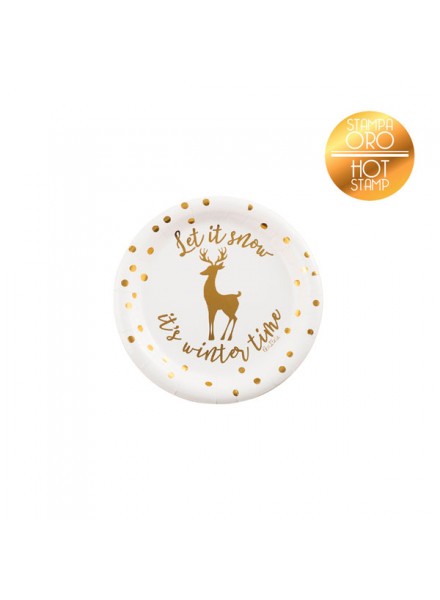 8 piatti in carta cm 21 Let It Snow. Il coordinato Let It Snow con la stampa dorata su sfondo bianco e' perfetto per un Natale di tendenza. I piatti rispettano l'ambiente: hanno ottenuto la Certificazione Aticelca e sono quindi riciclabili nella carta.
