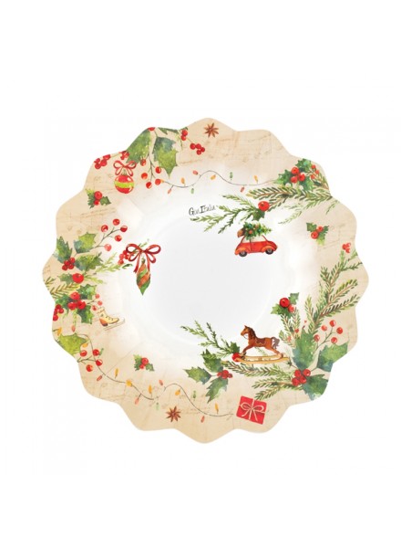 8 piatti in carta da 21 cm decorati con addobbi tipici dell'albero di Natale: macchinina, cavallino a dondolo, pattino da ghiaccio e palline ornate. I piatti Jingle Bells rispettano l'ambiente: hanno ottenuto la Certificazione Aticelca e sono quindi riciclabili nella carta.