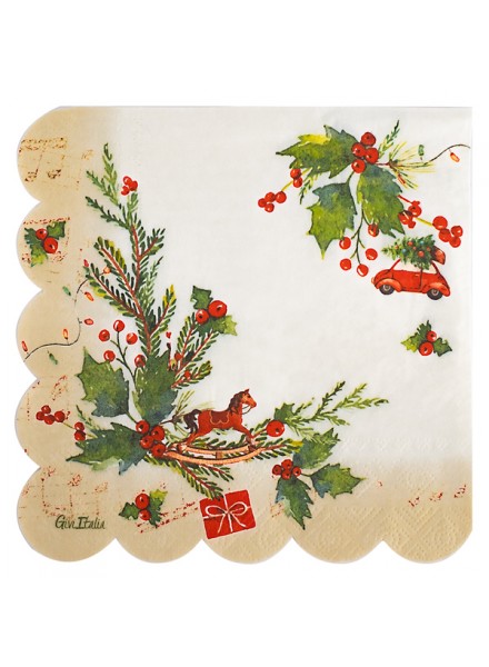 16 tovaglioli in carta a 3 veli con smerlo decorati con addobbi tipici dell'albero di Natale: macchinina, cavallino a dondolo, pattino da ghiaccio e palline ornate. Dimensione 33x33 cm. I tovaglioli Jingle Bells rispettano l'ambiente: hanno ottenuto la Certificazione Aticelca e sono quindi riciclabili nella carta.