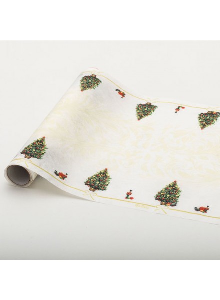Runner tavola largo 28 cm e lungo 3 metri bianco decorato con ricche ghirlande di pungitopo, eleganti palline e maestose stelle di Natale. Ideale per dare un tocco di classe alla tua mise en place.