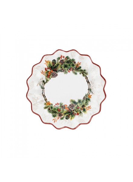 8 piatti in carta 21 cm con decoro autunnale. Tinte calde per creare una mise en place unica, calda e accogliente. Decorato nelle nuances del rosso vermiglio, arancione, verde scuro e marrone con elementi naturali come foglie, bacche e piume inseriti in una corona di rami di abete impreziositi dalla silhouette di graziosi animali del bosco. I piatti Fairy Forest rispettano l'ambiente: hanno ottenuto la Certificazione Aticelca e sono quindi riciclabili nella carta.