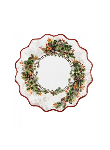 8 fondine in carta 24 cm con decoro autunnale. Tinte calde per creare una mise en place unica, calda e accogliente. Decorato nelle nuances del rosso vermiglio, arancione, verde scuro e marrone con elementi naturali come foglie, bacche e piume inseriti in una corona di rami di abete impreziositi dalla silhouette di graziosi animali del bosco. Le fondine Fairy Forest rispettano l'ambiente: hanno ottenuto la Certificazione Aticelca e sono quindi riciclabili nella carta.