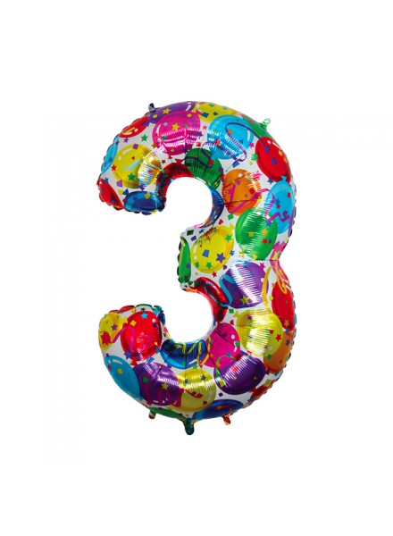1 pallone numero tre cm 102 Multicolor. Il palloncino in Mylar, gonfiato ad aria o ad elio, e' un accessorio indispensabile per la festa di compleanno.