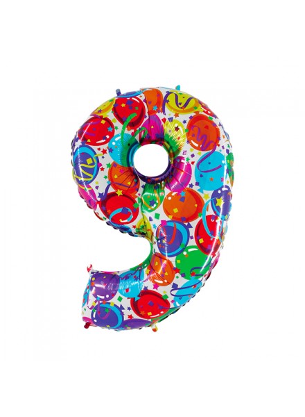 1 pallone numero nove cm 102 Multicolor. Il palloncino in Mylar, gonfiato ad aria o ad elio, e' un accessorio indispensabile per la festa di compleanno.