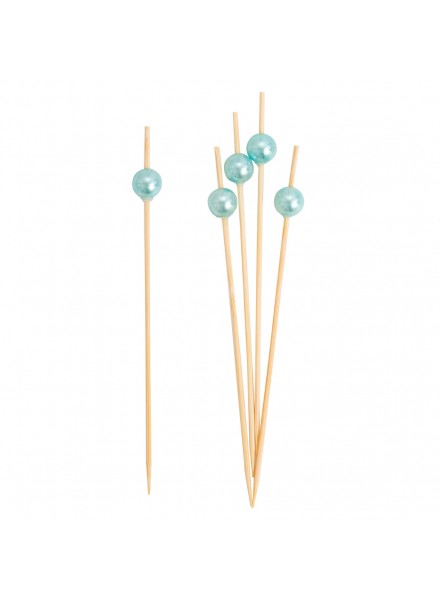 25 picks in acetato con perle azzurre. Perfetti per decorare in modo originale i dolci o le torte di compleanno oppure per essere utilizzati in un aperitivo o buffet. Altezza 12 cm