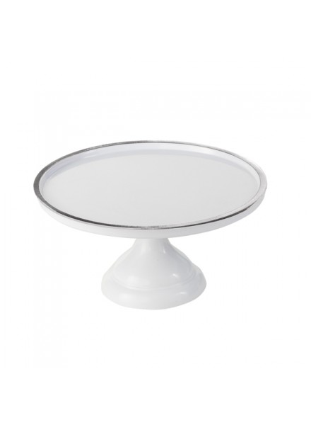 Alzata in melamina bianca con bordo argento diam cm 23, altezza cm 12. Indispensabile per completare la tavola, presentare torte e per le confettate
