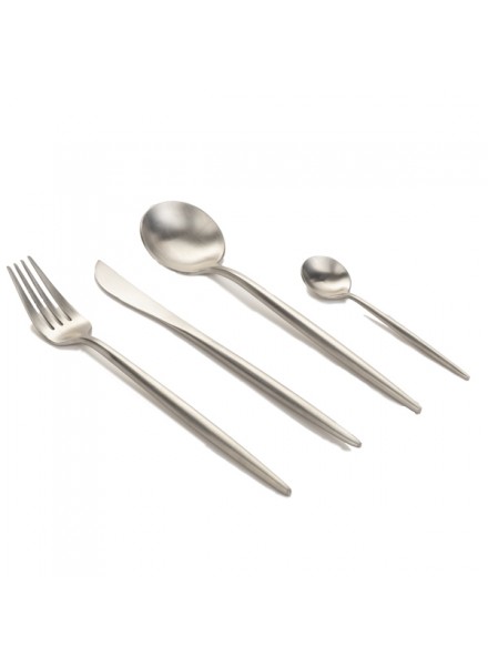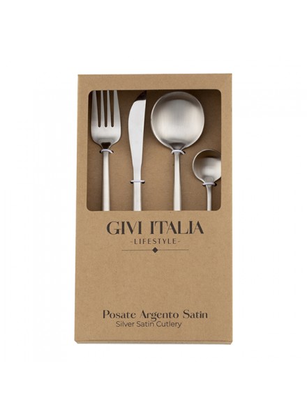 4 posate in acciaio inossidabile argento satinato metal. Le posate Givi Italia della linea Lifestyle sono un dettaglio che rende preziosa ogni mise en place. Lavabili a mano e riutilizzabili Forchetta cm 22.8, coltello cm 21.6, cucchiaio cm 22.2, cucchiaino cm 13.